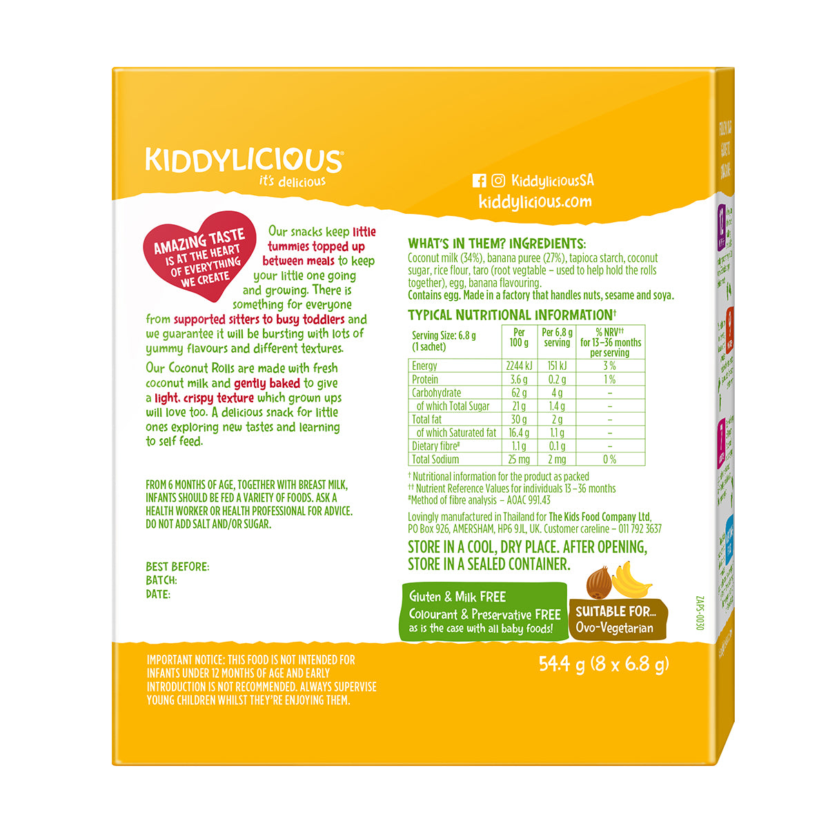 Our banana flavoured coconut rolls are made with fresh coconut milk, gently baked to give a light, crispy texture which grown ups will love almost as much (if not more) than the kids! Tube shaped with a hollow center, they're great for helping little hands develop that pincer grip.
